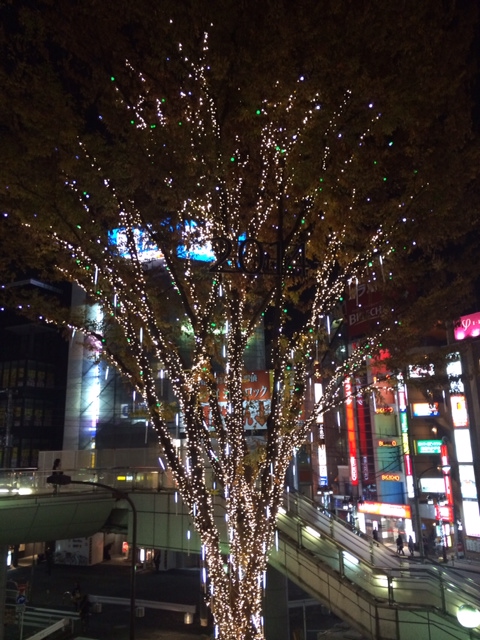 12月ともなると、立川駅前では各所でイルミネーションが動き出した様子。目立つところでは駅の南北。南口のロータリーの中および周辺では数日前から街路樹等に仕込んでいた様子の灯りが入りだした。