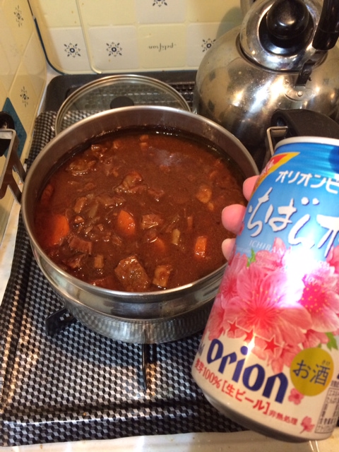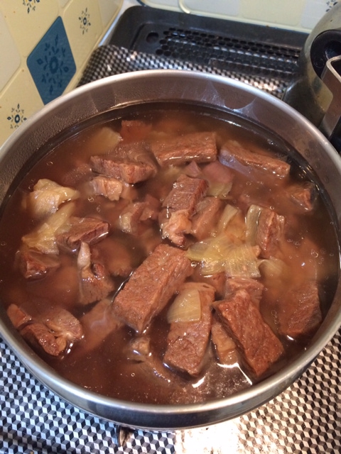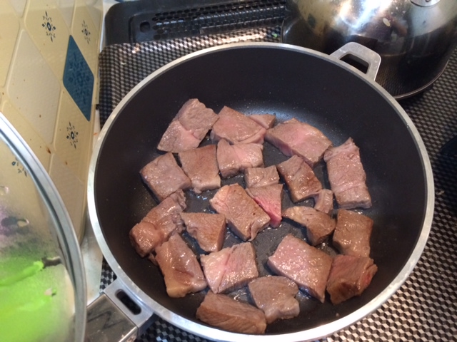 大きめに切って軽く焼き目をつけ、飴色玉ねぎと一緒に圧力鍋で加熱し、更に保温鍋に移し替えてもう一煮立ち。