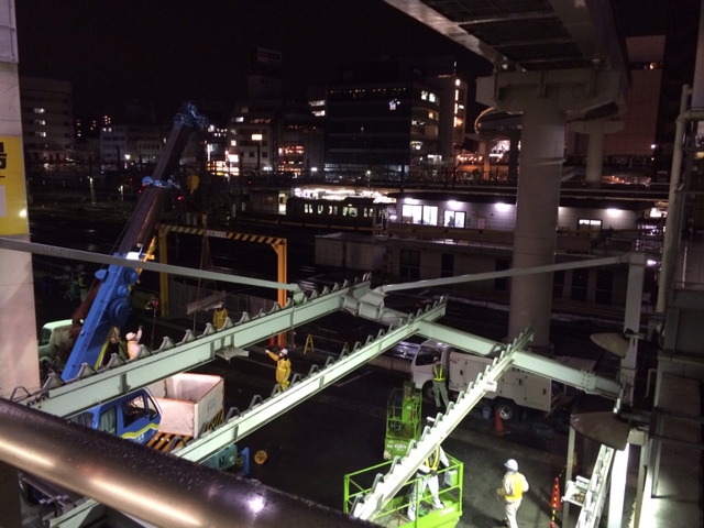 実況中継 With time and care 2014/03/04 Fuji 立川駅の西側に新たな自由通路を作る話を耳にしてから随分な時間が経ったような気がする。 傍目には動いているのか止まっているのか全く分からなかったが、今夜は自由通路の予定地付近にあるビルの搬入口の庇をご丁寧に解体していた。 ガスバーナーやカッター等で叩き切る様子はなく、予めそうなることを見越していたかのようにボルトなどの繋ぎ目を外してはクレーンで部材を搬出するの繰り返し。