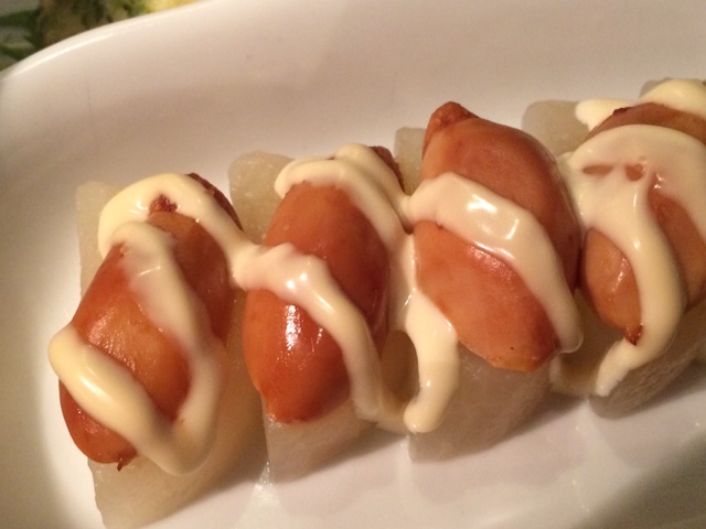 ダシを含ませた大根に茹でたタラコをのせ、上からチーズ風のソースをかけたものらしい。