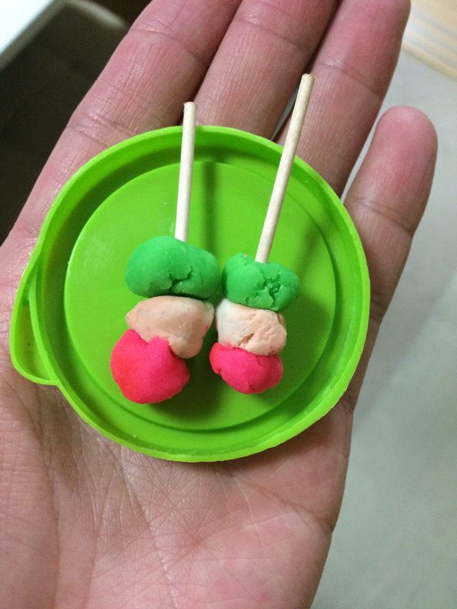 一連の仕込みの様子を見ていた娘も何かに触発されたのかは定かでないが、粘土細工で三色団子とミニ人参を作ってきた。