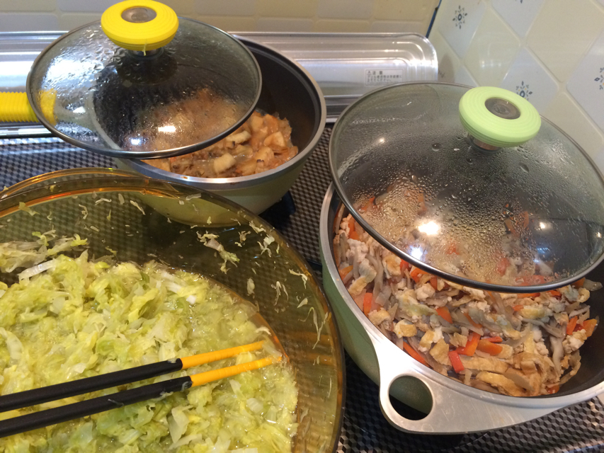 昼の部は海鮮混ぜ御飯の素と、和風混ぜ御飯の素と、ザワークラウトを仕込み中。とはいっても、海鮮混ぜご飯の素は、冷凍のシーフードミックスを加熱して適度に味をつけておくのみ。これだけで随分とかさが減るというから大したものだ。和風混ぜご飯の方は鶏ごぼうとだしつゆの定番ともいえる味。ザワークラウト共々、週単位での保存を狙う。