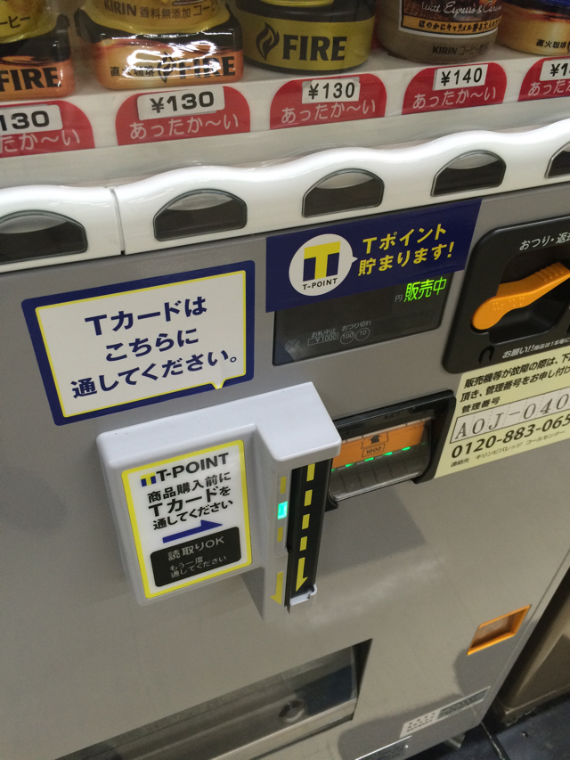 実況中継 Card reader on vending machine 2015/02/27 Fuji いまどき珍しいTポイントのたまる自販機を発見。 この勢いでクレジットカードも使えるようになると嬉しい。 Suica/Edyもそれなりに使える場所が多くて便利だが、いかんせんオートチャージのできるシーンが限られており使い勝手はもう一息である。
