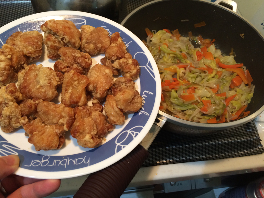 お徳用の冷凍唐揚げにかけて、ひとまず晩飯のおかず兼おつまみの完成。炒め物の一部は翌朝の弁当行き。あとで肉のおかずも冷凍ストックの中から探しておかねば。