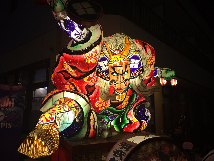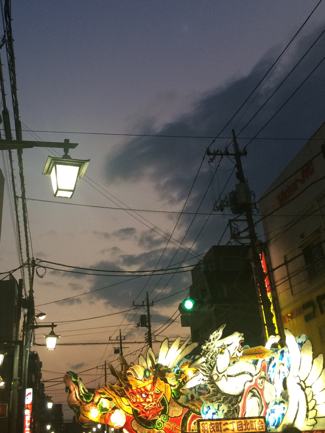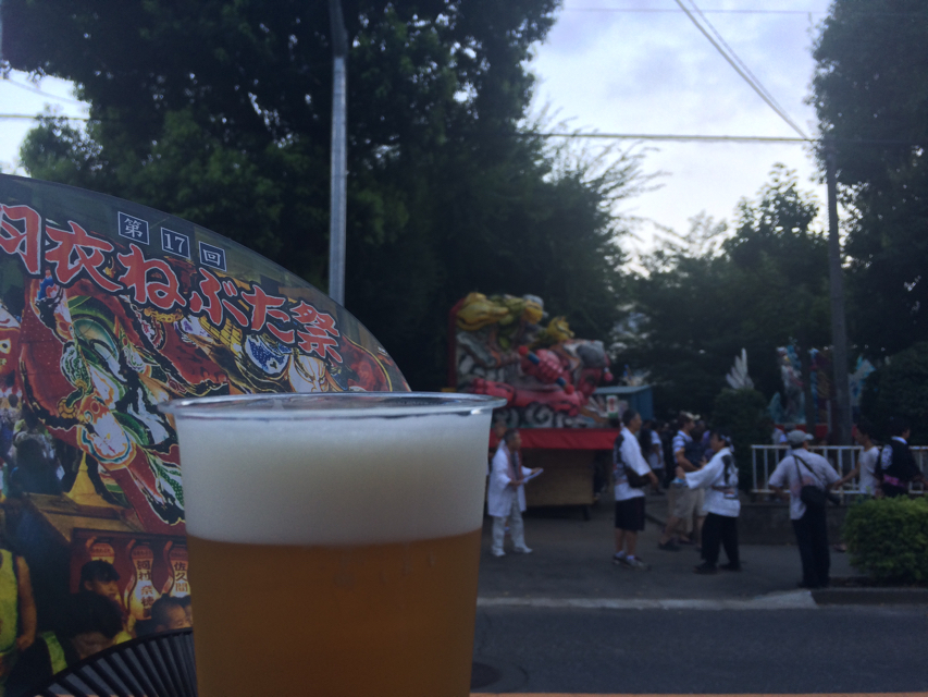 帰省の片付けもそこそこに羽衣ねぶたの会場に繰り出すと、丁度ねぶたが出てきたところであった。 沿道の店が混み合う前に腹ごしらえを済ませ、その間にお供の1杯を用意しつつ、会場とねぶたに灯りが入ったら祭りのスタート。