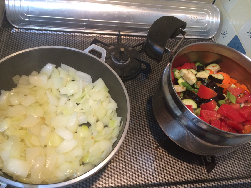 帰省の恒例なのかはさておき大量に持たされた夏野菜を消化すべく、昼飯には野菜カレーを仕込む。