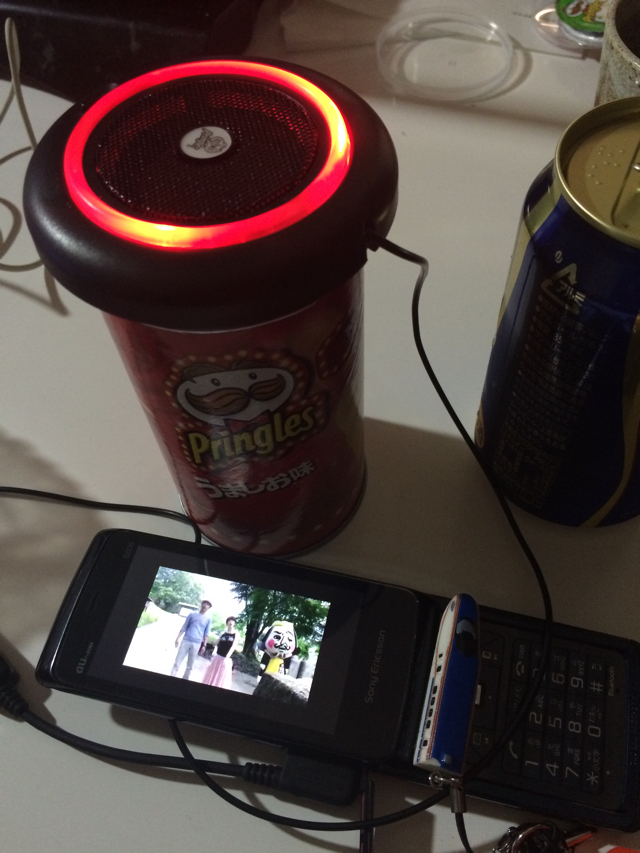 ガラケーからの音をスピーカーに通し、エンクロージャーを付けたり外したりして音の違いに聞き入る。