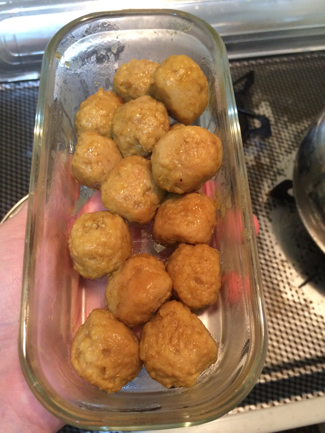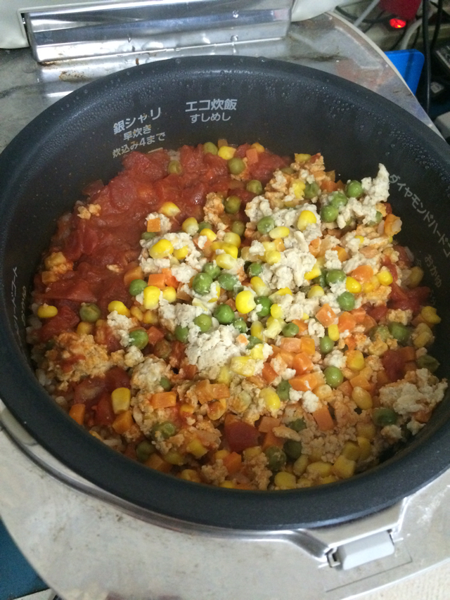 今週の週末クッキングは、カレー&コンソメ味の肉団子、チキンライス風炊き込みごはん、粉ふきいももどき。