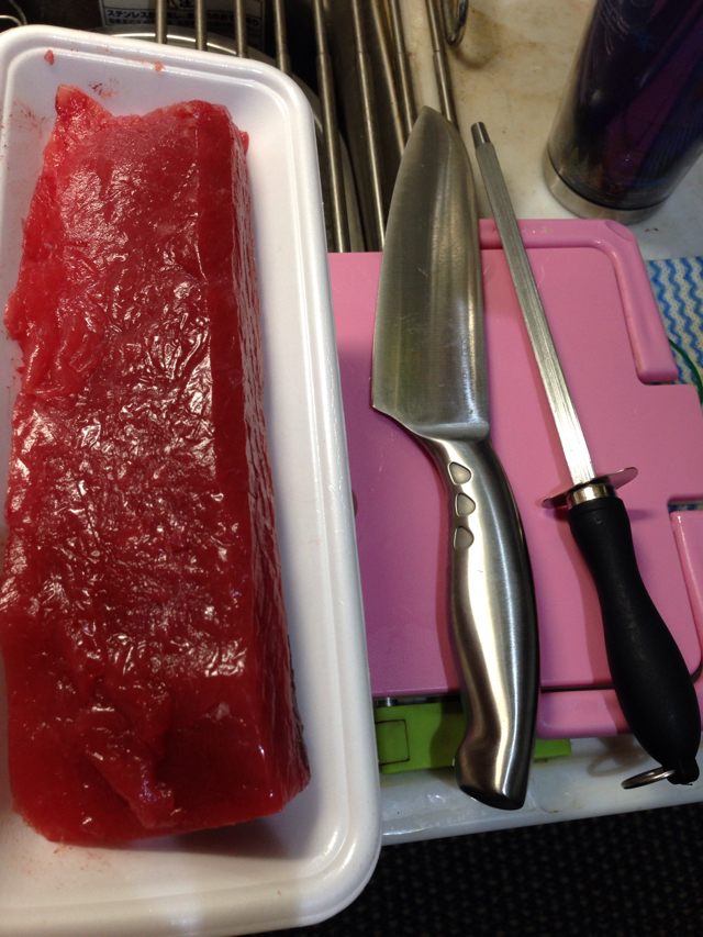 実況中継 Lean fish 2015/12/13 Fuji 魚屋での鮪の実演解体で切り出された赤身を入手。 晩飯では早速お子様たちの納豆鮪丼と大人用の刺身に分けたが、娘は刺身がお好みらしい。なんと贅沢な。 こういう調子なので赤身の冊はあっという間に全量消化された。 切れ味のよい包丁は、材料の味もきっちり生かしてくれる。