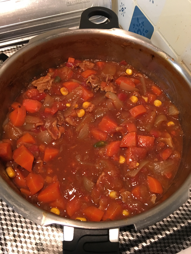 実況中継 Mild curry 2016/02/27 Fuji この日の夜は、トマト缶&冷蔵庫にあった野菜と豚肉をあるだけ圧力鍋に放り込んで野菜たっぷりカレー。 野菜からの水分とお供のペーストで今回もかなり甘いが、お子様たちが喜んでおかわりしてくれるので結果オーライ。これ以外の方法でムスコに野菜を食べさせる方法があれば言うことなしだが。