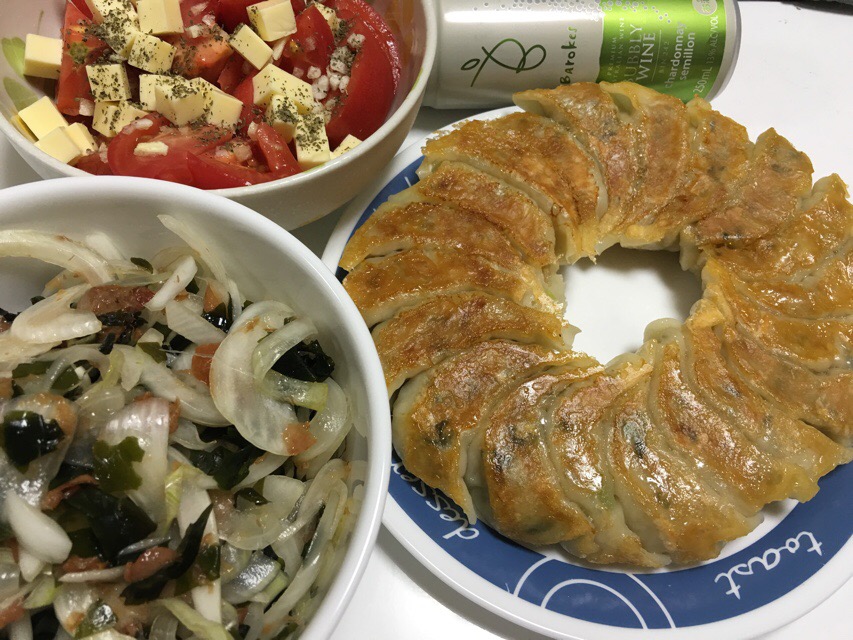 実況中継 Sharp 2016/06/05 Fuji 晩のおかずは餃子とトマト&チーズのサラダに新玉ねぎ&ワカメの梅おかか和え。玉ねぎで涙が出るかは包丁の切れ味次第ということを確信。たまには、と缶のスパークリングで晩酌とす。 しかしこの新玉ねぎのサラダ、素材共々水の滴るサラダになってしまう。鰹節以外にも水気を固定する手段が要りそうだ。 適当な乾燥食材を追加してみるか。