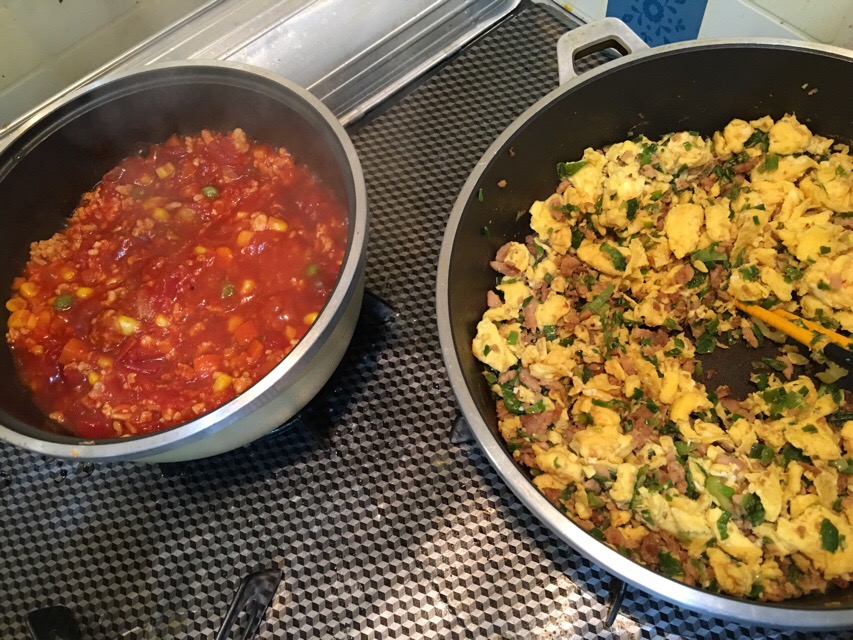 実況中継 Used in mixture 2016/06/05 Fuji トマトソースと、初挑戦のチャーハン風混ぜご飯の素を作る。トマトソースの方は、そのままパスタやご飯と混ぜるだけだが、チャーハン風混ぜご飯の方は後日鶏ガラスープで炊いたご飯に合わせるように、ネギと焼き豚を刻んだものと卵を合わせてある・・・が、単品で炒り卵としても食べられそう。 勢いついでに卵焼きも作る。これで当面の弁当のおかずは確保。