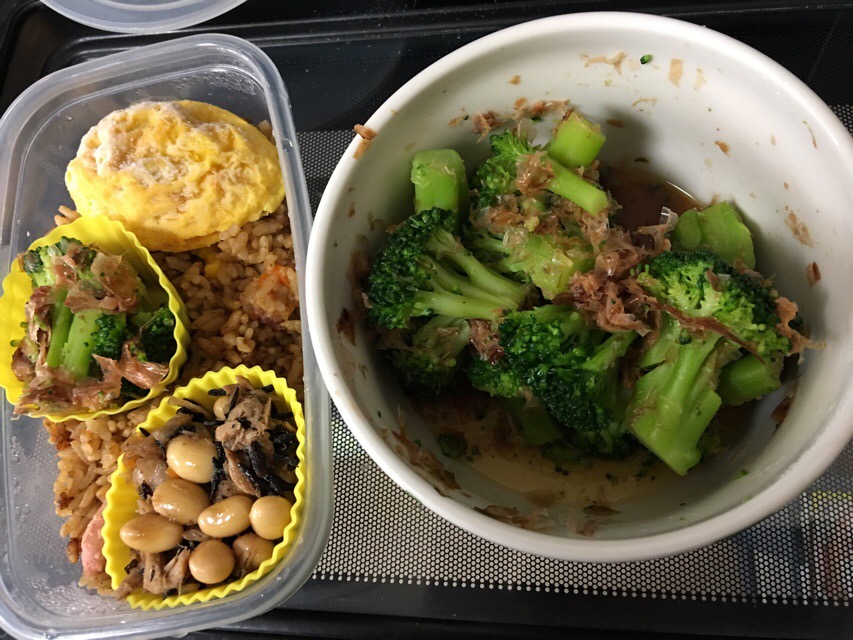 実況中継 Supplementary 2017/02/14 Fuji 混ぜご飯と煮豆とオムレツのお弁当にもう一品と思い立ち、ブロッコリーのおかか和え。レンジでものの数分で出来上がり、一週間は冷蔵庫の保存も効く頼もしい一品。