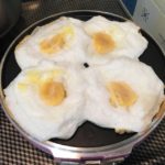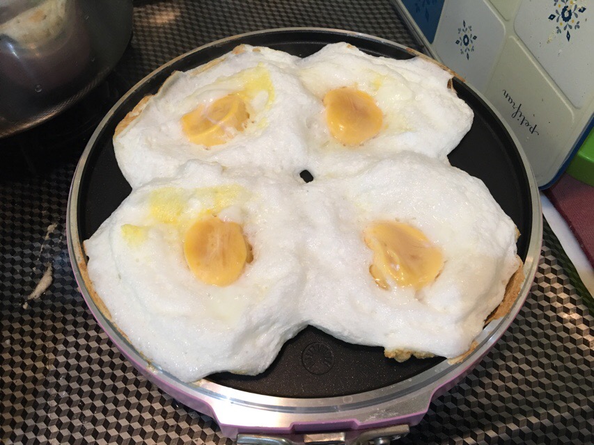 実況中継 Cloud (returns) 2017/02/26 Fuji クラウドエッグ再び。 前回はグリルで焦げたこともあり、今回はフライパンで蒸し焼き。底がこんがり、本体はふんわりと焼け上がった。蒸し焼きは扱いが楽でいい。 隣で嫁とお子様が作っていたサンドイッチと共に、遅めの朝食とする。