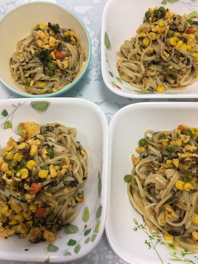実況中継 Use the old trick 2017/04/07 Fuji 前日作った高菜と卵と野菜ミックスの混ぜごはんの素をうどんに絡めてみる…が、ご飯の素を翌日うどんに使う活用パターン、先週も使ったような…?