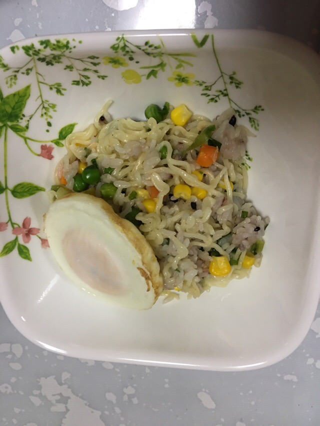 実況中継 Replace 2017/04/17 Fuji 親子揃って調子がイマイチ…そんなときにはイトメンのチャンポンめんを使ったラーメン雑炊。砕いた麺と冷凍の野菜ミックスをスープで煮たところに本来なら卵を溶いて混ぜるが、作り置きの目玉焼きがあったのでのっけ盛りにする。