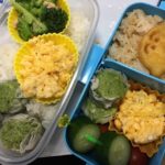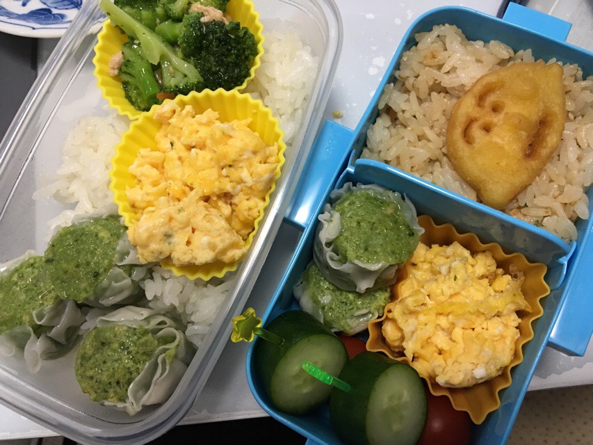 実況中継 A beginning of a fiscal year 2017/04/19 Fuji 今年度も親子お弁当競作のスタート。作り置きの炒り卵と冷凍のほうれん草入り焼売を共用しつつ、ムスコにはキュウリ、自分の方はブロッコリーのそぼろ和えを追加し、どことなく新緑の多そうな仕上がり。