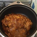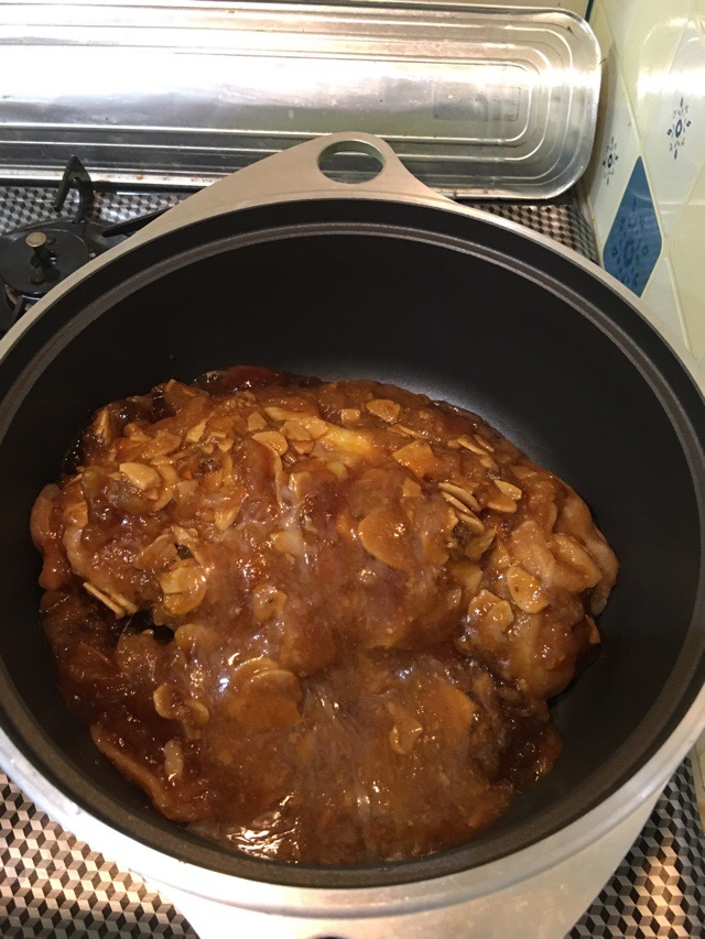 焼くつもりで保存しておいたが随分な量の煮凝りスープが残っていたため、玉葱を加えて豚丼風煮込みに変更。保温鍋で一晩ゆっくり煮込み、蒸し野菜にのせる。ホットサラダ風の仕上がり。