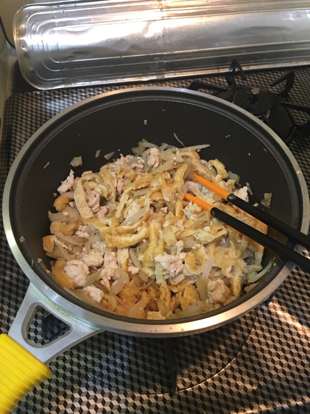 一息ついたところで冷凍庫から鶏挽肉、ごぼうと刻み薄揚げとダシつゆで混ぜごはんの素を作り、この日のお盆前食材加工ラッシュは終了。