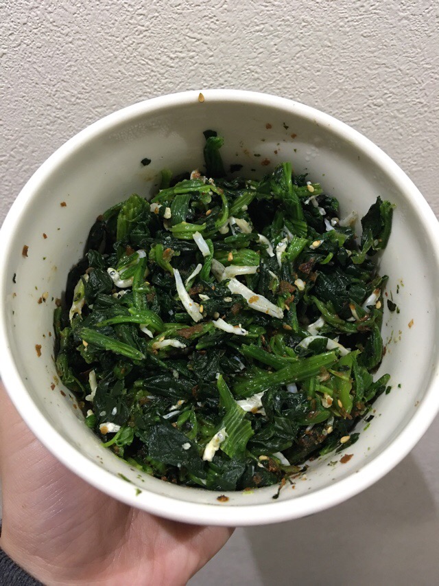 実況中継 Interim …? 2017/12/05 Fuji 冷凍庫のほうれん草としらすでおひたし作り。味付けは鰹節とダシつゆの代わりに鰹味のふりかけ。年末の食材蔵ざらえの産物ではあるが、ふりかけが水分を適宜吸着してくれるおかげでお弁当には扱いやすい。しかしこのイレギュラーな和え物はいつまで続くやら。