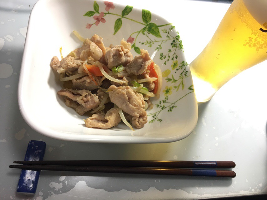 実況中継 In reduced illumination 2017/12/05 Fuji 帰宅後、作り置きの肉野菜炒めで晩酌。寝た子を起こさぬよう、明かりは控えめに、ゆっくりといただく。肉をタレ漬けにしておいたこともあり、割と日持ちはするようだ。汁気をやりくりしてお弁当にもできそうだが、温めた際の香りに工夫の余地あり。