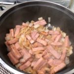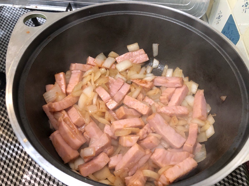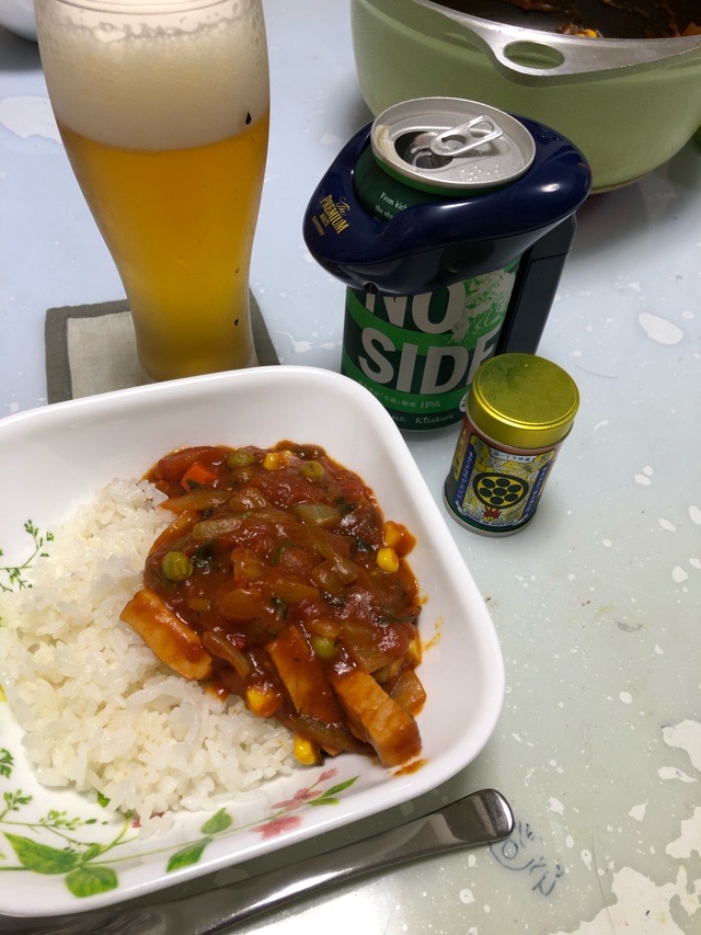 実況中継 Chunk 2019/09/29 Fuji 当夜は厚切りの刻みハムとタマネギたっぷりのカレー。一緒にじっくりと炒めてからいつものようにトマトや冷凍野菜などを加える。塊から切った肉のような大きさではあるが、ハムなので火の通りをあまり気にしなくて済むのは楽。しかもほどよい食感。