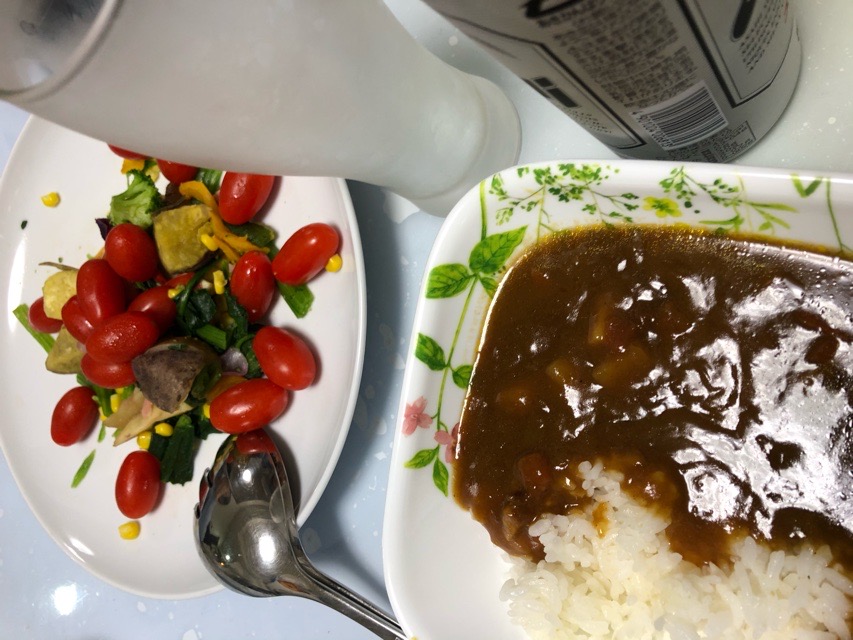 実況中継 Checker 2019/10/23 Fuji 店先で見つけた冷凍根菜セットにミニトマトを組み合わせてサラダに仕立てる。 色合いはなかなか。 ストック消化も兼ねたレトルトカレーに青物と色合いの補充。