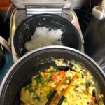 実況中継 Sure thing 2019/12/15 Fuji 今回は混ぜるだけ炒飯もどきでお昼とする。半熟までで炒めた卵と野菜の具を、適量のスープの素や醤油などと一緒に、熱々の炊きたてご飯から後日のストックを差し引いた分と混ぜて数分寝かせる。卵などに熱がまわる頃合いで必要に応じて味を足して出来上がり。