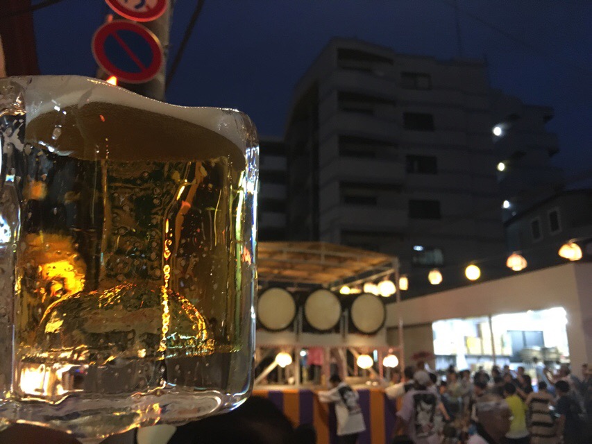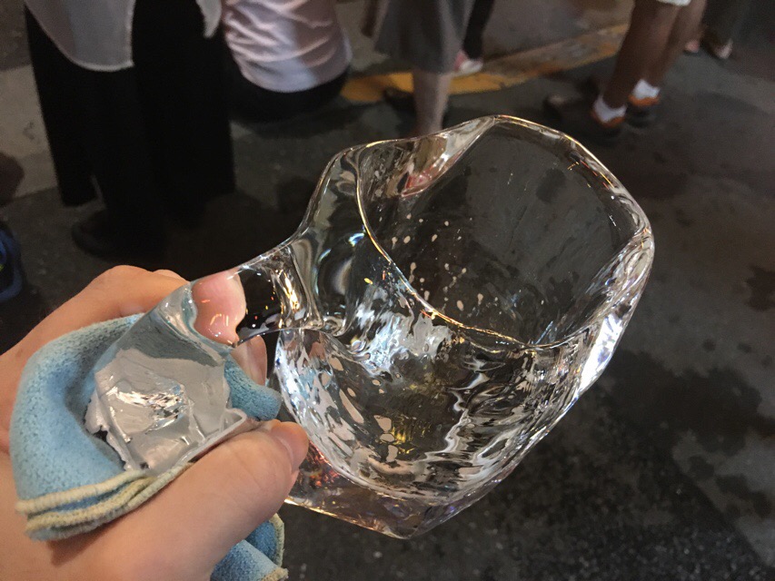 ねぶた巡行前に、一度はやってみたかった沿道の氷屋特製の氷ジョッキ入りビールを味わう。