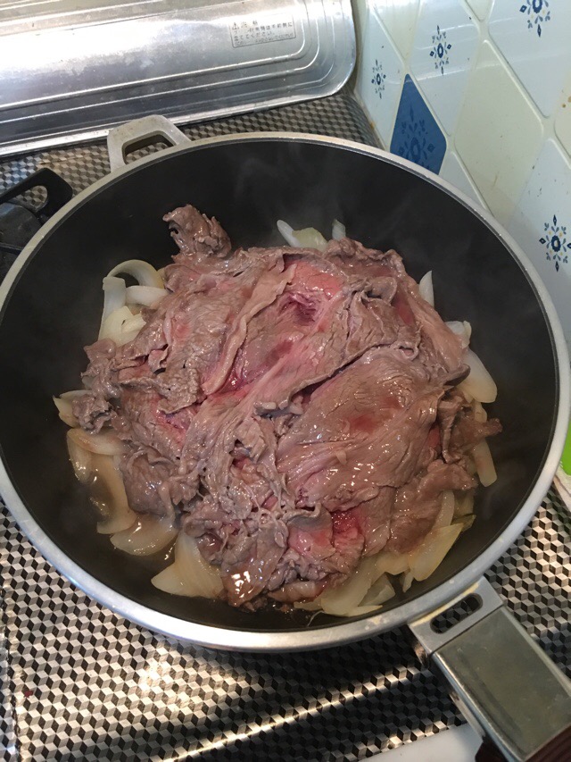 玉ねぎにある程度火が通ったところで、肉が塊にならないように広げつつ乗せて蒸し焼き風に火を通していると、玉ねぎのみずみずしさのおかげで炒め煮風に変化。