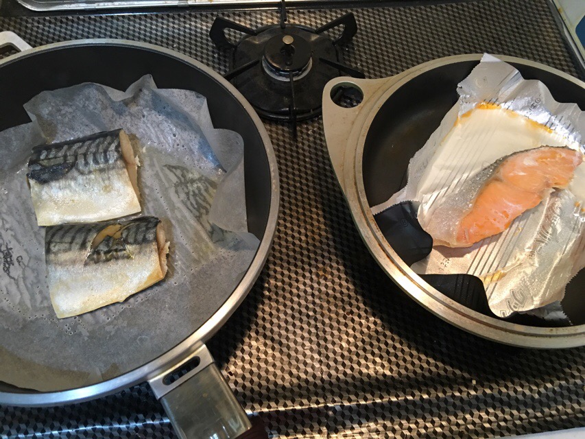 鯖と鮭の蒸し焼き。お弁当を念頭に魚の切り身をフライパンで蒸し焼きに加工しているが、やはりというか、お弁当に入れるには少々大きい。