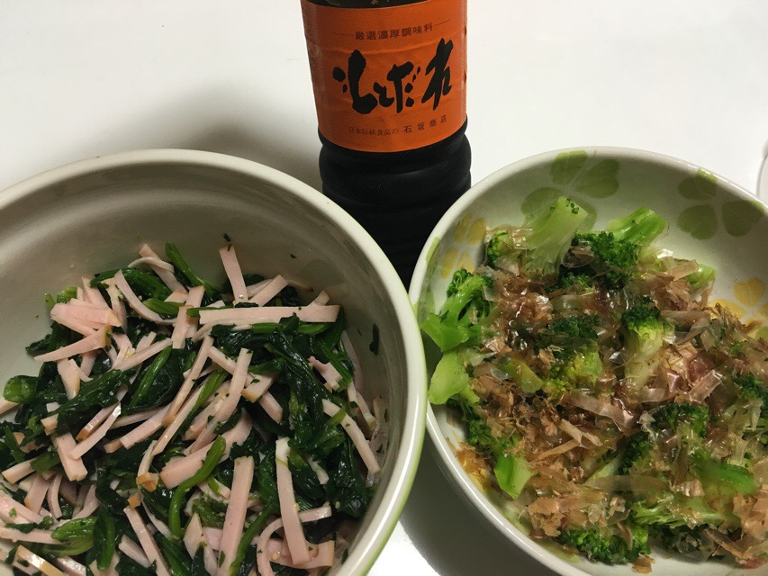 あえもの2種。今回は刻みハム&ほうれんそうのものと、ブロッコリーのおかか和えを仕込む。
