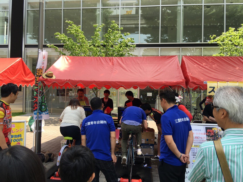 TOKYOまちフェスタにて、チャリティと称してKEIRIN体験コーナーに娘と挑む。ママチャリと競輪仕様の自転車が並んでおり、200mのバーチャルなコースをひた走る。