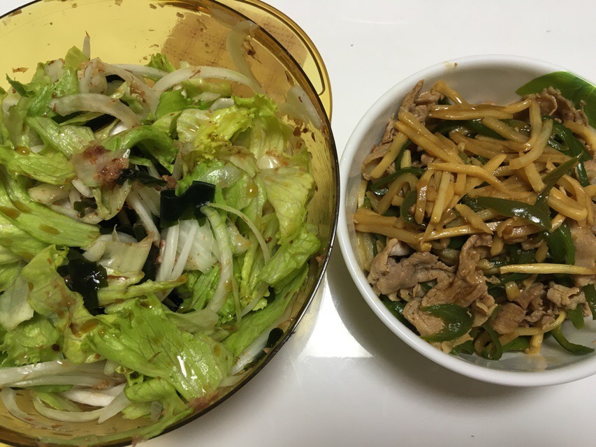 新玉ねぎとレタスとワカメのサラダに、薄切り豚肉の青椒肉絲もどきを作る。嫁とお子様たちはご飯をお供に晩飯。自分は昭島のくじらビールをお供に晩酌。