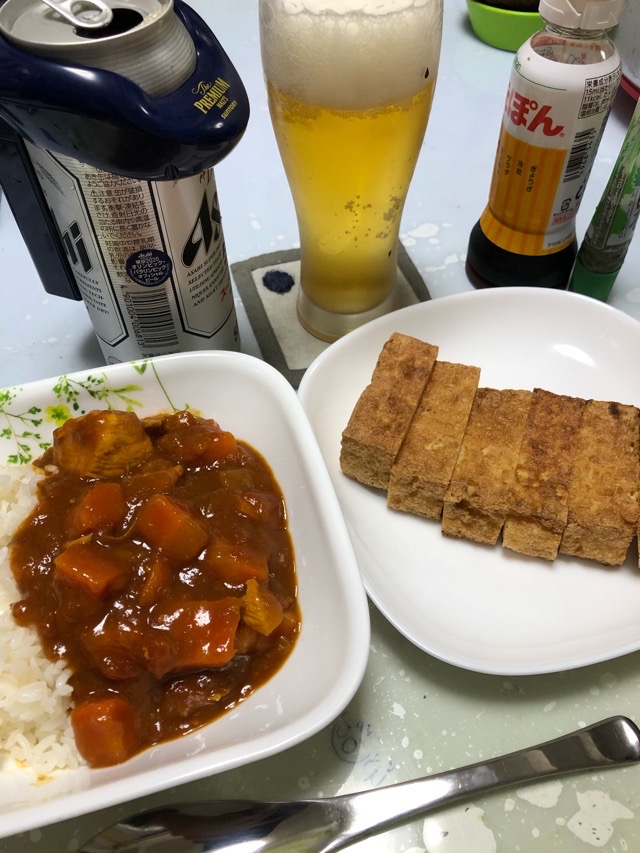 週末カレーの前に、最後の厚揚げを味わう。近場の豆腐屋が店じまいと聞きつけ、最終日に厚揚げを取り置き。その日は瞬く間に売り切れたという。表面を焼いてポン酢でいただく。続くカレーは鷄と人参を中心に具大きめ。