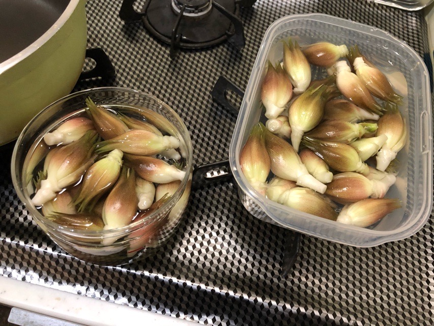 吉例に従い甘酢漬けを予定しているが、慌てて加工しなくてもよいらしい、とわかったため、外側の皮と土を落とした後は水につけて一時保存とする。これで1週間もつというから、大した生命力かもしれない。